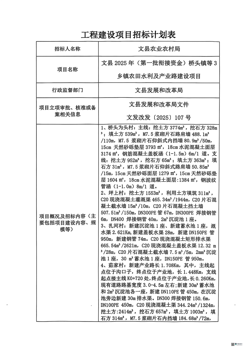 文縣2025年(第一批銜接資金)橋頭鎮(zhèn)等3鄉(xiāng)鎮(zhèn)農(nóng)田水利及產(chǎn)業(yè)路建設(shè)項(xiàng)目
