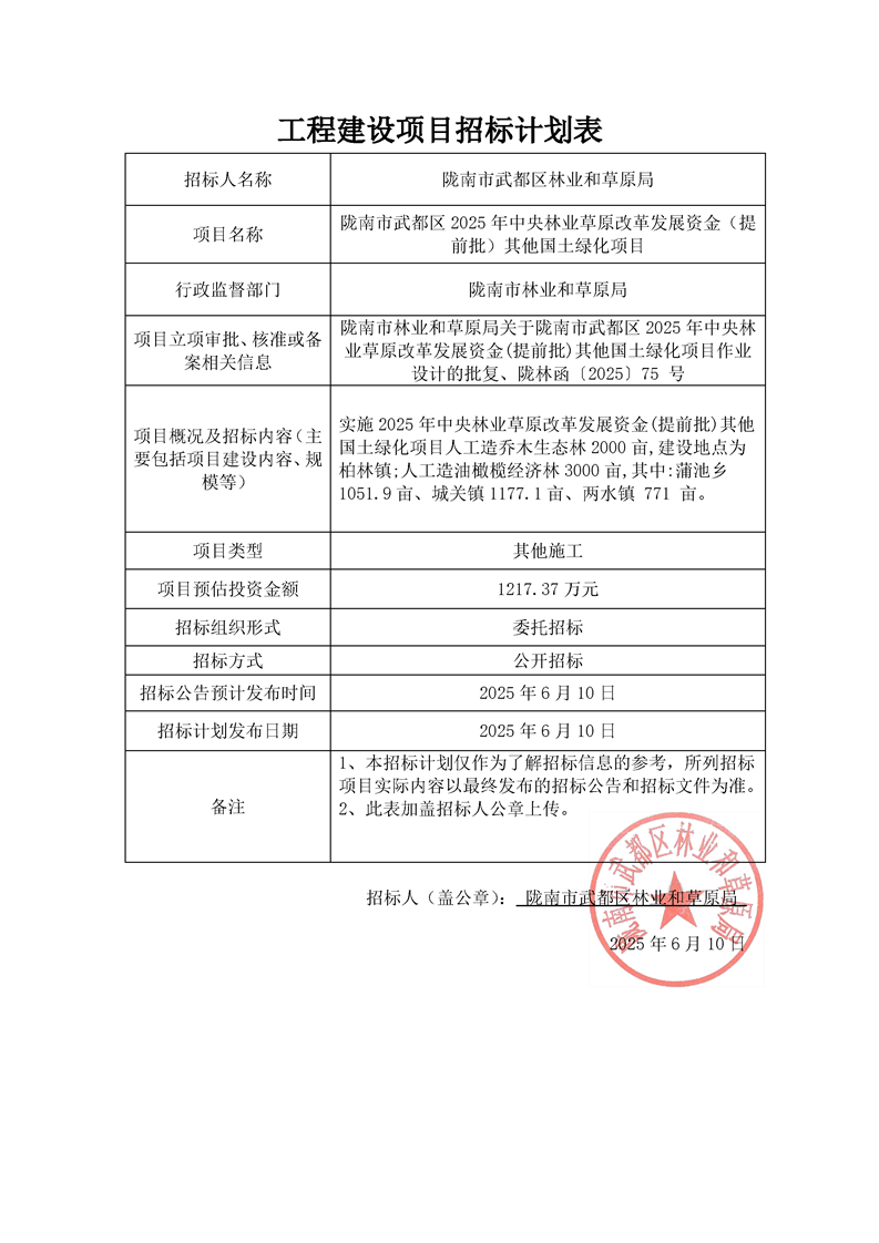 隴南市武都區(qū)2025年中央林業(yè)草原改革發(fā)展資金(提前批)其他國土綠化項目