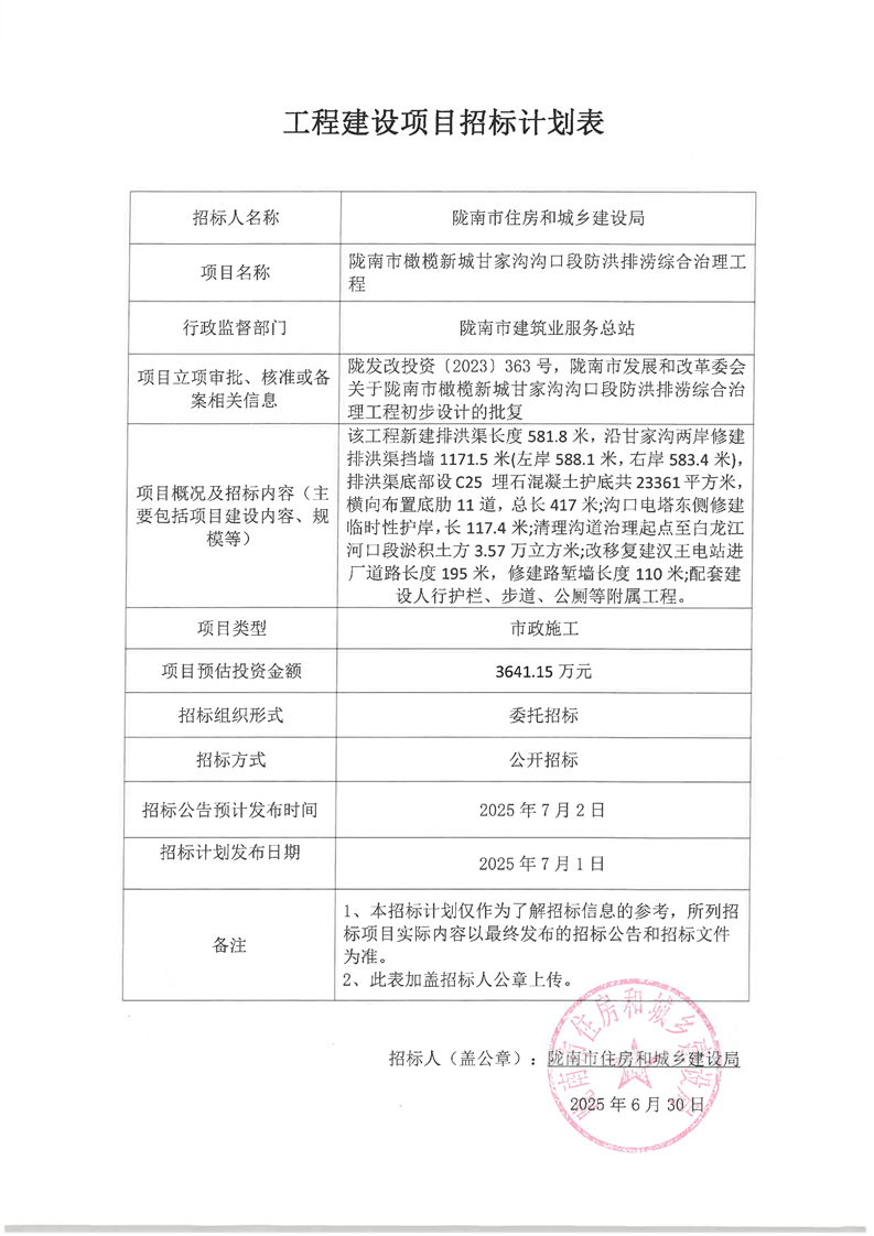 隴南市橄欖新城甘家溝溝口段防洪排澇綜合治理工程